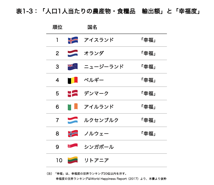 岩崎先生は「農業は人々の『幸せ』の源泉となる産業である」と語られます。一つの事例として、「人口1人あたりの農作物・食糧品の輸出額が多い国」、つまりその国において「農」や「食」の相対的な地位が高く、国際的な競争力もあることを示唆しているランキングからは、幸福度にかなりの正の相関が見られることに気付かされます。