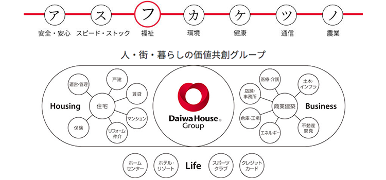 「人・街・暮らしの価値共創グループ」として、住まいに、街に、暮らしに、将来に求められていることはなにかを常に考え、創業以来培ってきた技術のノウハウを活かして、多彩な研究開発を推進されてこられた大和ハウスグループ。“明日の社会”に必要不可欠のを意味する「アスフカケツノ」をキーワードとした商品やサービスを開発、新たな価値を社会に届けてこられました。